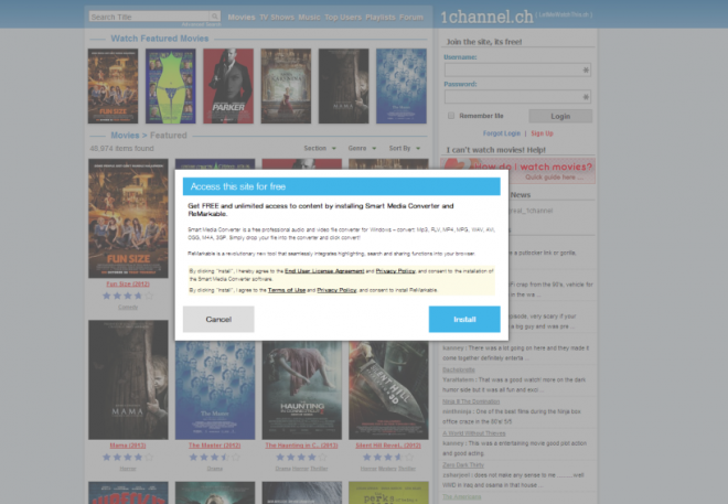The image above belongs to www.1channel1.ch. In this case, the pop up is even worse as it doesn’t even allow you to stay on the site, unless you download a non-related tool to access. Too far!