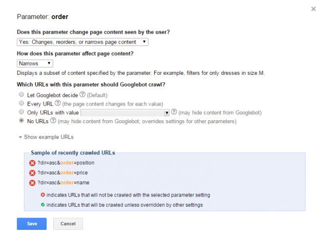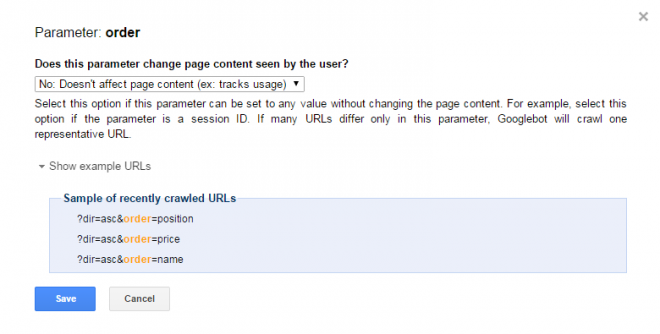 If you press ‘Save’ at this point the Parameter will be configured as a ‘Representative URL’. This tells Google that if it locates many that URLs differ only in this parameter (so not the hierarchical part of the URL or the value in the field-value combination), Googlebot will only crawl one representative URL, rather than all of them.