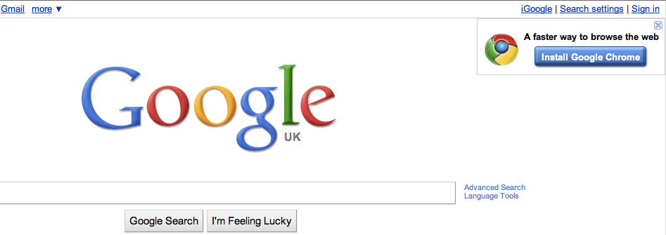 However one person in the Blueclaw office is unable to view this in his browser of choice, Mark one of our designers who like all hippy creative types chooses to use OSX and browses the web using Safari 5. Instead of the much talked about doodle Mark is greeted with an message telling him to install Google Chrome for “A faster way to browse the web”.