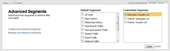 If you want to apply your segment to any report, simply use the ‘Advanced Segments’ pull-down menu at the top right-hand corner of your account, then click the ‘manage your advanced segments’ link and select the ‘apply to report’ option or alternatively select the segment you just created from the Advanced Segments pull-down menu found at the top of all your Analytics reports.