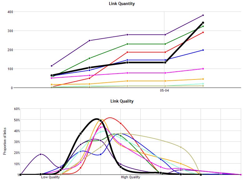 What I like about Link Insight is the really simple graphs for link quantity but more importantly, the quality. You also get to see your site and how it fares against your competitors, shown here in different colours. Link quality is judged on links from ‘Trust‘ websites compared to ‘Spam‘ websites. The ideal situation is a bell curve that leans towards ‘High quality’ links. More on this later on.