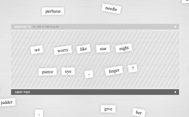 Twitter Magnets Everyone has time for fridge magnets, somehow you feel that these magnetic words shaped into obscure sentences counts as poetry. Twitter Magnets loads some magnets for you to create a work of art (in under 140 characters of course) and dedicate it to someone on Twitter or post it to @TwitterMagnet.